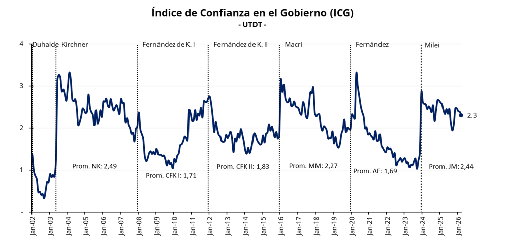 Según el relevamiento de la Universidad Torcuato Di Tella, el Índice de Confianza en el Gobierno (ICG) de marzo mostró un descenso hasta los 2,30 puntos. Esta contracción mensual del 3,5% sitúa al proxy de intención de voto en torno a un 46%. En la comparativa histórica para un tercer año de mandato, el índice actual arroja una dinámica similar a la de Mauricio Macri en 2018 (ICG 2,32; -0,9%), pero muy superior a la de Alberto Fernández (ICG 1,31; +52,6%).