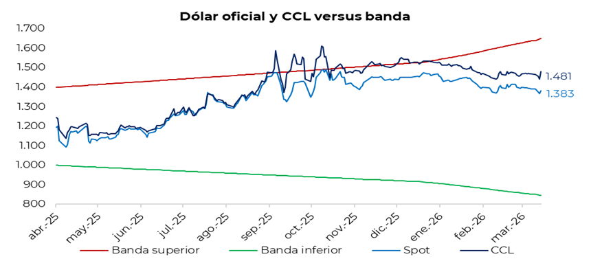 El tipo de cambio oficial cerró con una suba de $15, ubicándose en $1.382. A su vez, los dólares financieros tuvieron una jornada al alza: el CCL finalizó en torno a los $1.480, con la brecha respecto del tipo de cambio oficial en la zona de 7,0%. En tanto, el dólar MEP cerró cerca de $1.455, manteniendo la brecha con el tipo de cambio oficial alrededor del 5,0%. Por último, el diferencial entre el CCL y el MEP se sostuvo en torno al 2,0%.