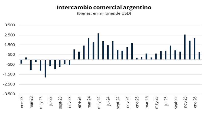 El INDEC dio a conocer la balanza comercial de bienes correspondiente al mes de febrero, que registró el 27° superávit consecutivo, alcanzando USD 788 millones (vs. USD 275 millones en febrero de 2025). Las exportaciones cayeron un 2,9% interanual, como resultado de una baja del 7,1% en las cantidades exportadas, parcialmente compensada por un aumento del 4,4% en los precios. En tanto, las importaciones se contrajeron un 11,8%, producto de una disminución del 14,9% en las cantidades importadas y una suba del 3,7% en los precios.