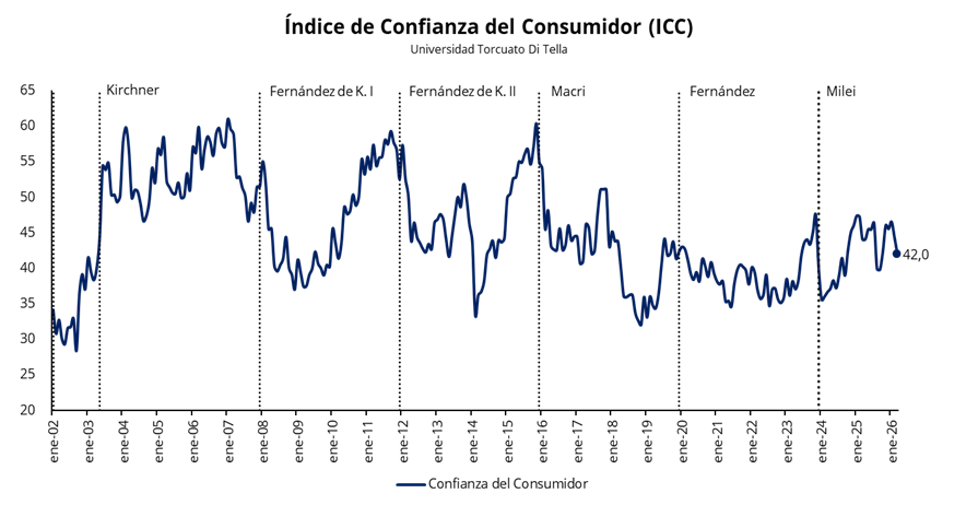 El Índice de Confianza del Consumidor (ICC) de la Universidad Torcuato Di Tella cayó un 5,3% en marzo, tras haber registrado una baja de 4,7% en febrero. Desde el mínimo alcanzado en septiembre, el índice se ubica un 5,6% por encima. En términos interanuales, se situó un 4,7% por debajo del nivel de marzo de 2025. Por regiones, se observó una marcada disparidad: la mayor contracción se registró en el Gran Buenos Aires (-9,4%), seguida por la Ciudad de Buenos Aires (-6,9%), mientras que el interior del país mostró una suba del 1,3%. Por nivel de ingresos, el índice también registró descensos mensuales en ambos segmentos: entre los hogares de ingresos bajos la caída fue de 6,9%, mientras que en los hogares de ingresos altos alcanzó 4,7%.