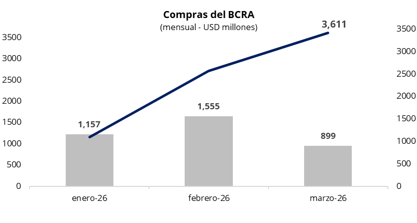 En una jornada con un volumen operado cercano a los USD 600 millones, el Banco Central concretó la mayor compra de divisas desde el 20 de febrero: adquirió USD 132 millones. De esta manera, acumula compras por USD 899 millones en marzo y USD 3.611 millones en lo que va del año. Asimismo, la autoridad monetaria absorbió cerca del 22% del volumen operado en el mercado, superando las jornadas previas y ubicándose nuevamente muy por encima del target de participación del 5%.