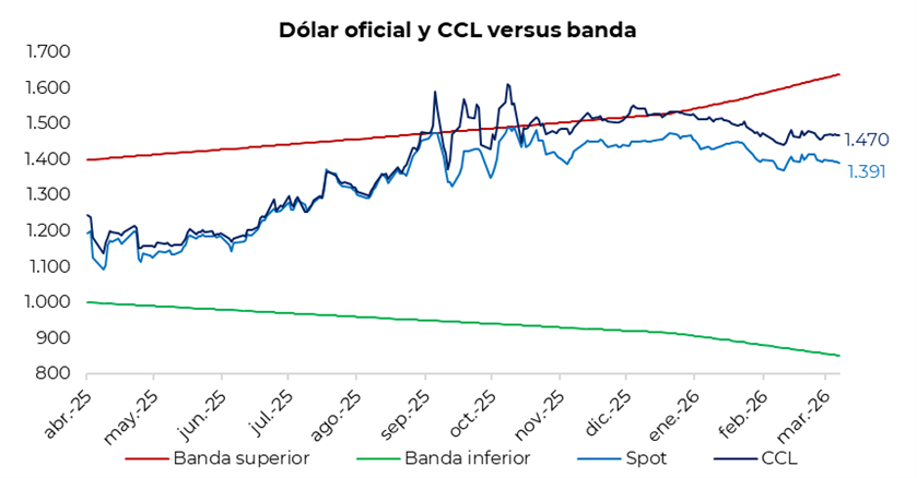En la rueda del viernes, el tipo de cambio oficial cayó un 0,3%, ubicándose en $1.390 (-$4,5 respecto al cierre del jueves). En la semana, el dólar oficial acumuló una baja de $9,5 y se ubicó un 15,1% por debajo de la banda superior de $1.639, marcando la mayor distancia desde junio de 2025. Por su parte, los dólares financieros mantuvieron la estabilidad observada a lo largo de la semana: el CCL finalizó en torno a $1.470, con una brecha frente al oficial cercana al 5,5%, mientras que el MEP cerró en torno a $1.420, con una brecha del 2,0%. Finalmente, el diferencial entre el CCL y el MEP se sostuvo en torno al 3,25%.