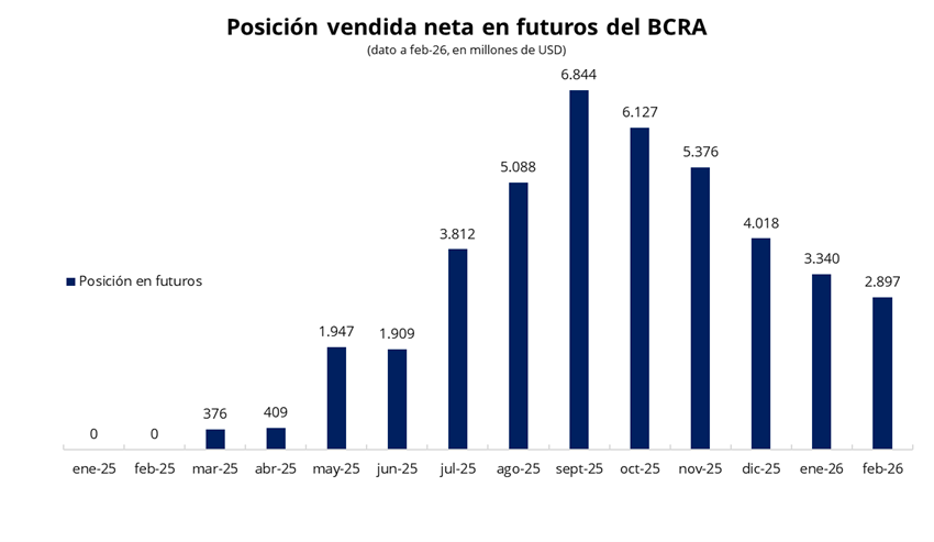Por otra parte, la posición vendida del BCRA en el mercado de futuros volvió a reducirse por quinto mes consecutivo y se ubicó en USD 2.897 millones en febrero. Esto implica una caída de USD 443 millones respecto de enero y marca el nivel más bajo desde junio. De esta manera, el BCRA continúa con el desarme gradual de su posición vendida en futuros en un contexto de mayor calma cambiaria, luego del tenso período electoral del año pasado. En este marco, la menor expectativa de devaluación reduce la demanda de cobertura por parte del mercado, lo que a su vez disminuye la necesidad del Banco Central de intervenir ofreciendo contratos.