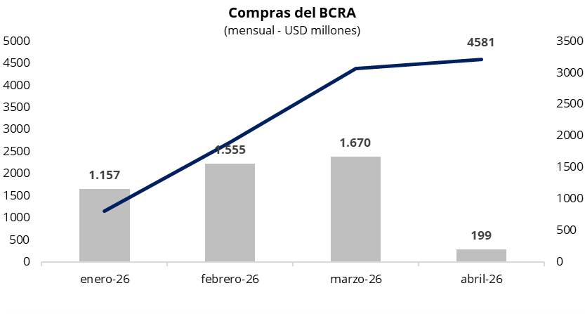El Banco Central compró USD 93 millones en una rueda con un volumen operado cercano a los USD 438 millones. De esta manera, el BCRA acumula compras por USD 199 millones en abril, y USD 4.581 millones en lo que va del año. Asimismo, la autoridad monetaria adquirió cerca del 21% del volumen operado en el mercado, retomando los niveles de compra vistos a fines de marzo, y por encima del target de participación establecido en 5%.