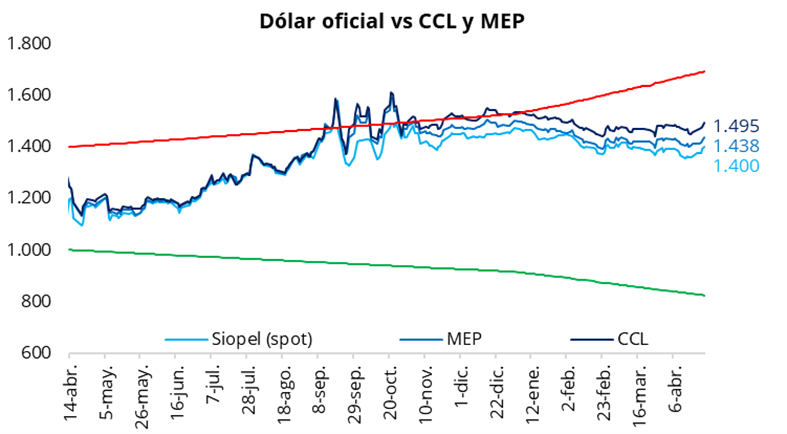 En la rueda del viernes, el tipo de cambio oficial se movió nuevamente al alza y cerró la semana en $1.399,5 (+$7,5 respecto del jueves). En la semana, el dólar oficial acumuló una suba de $35 y se ubicó un 17,4% por debajo de la banda superior de $1.694. En la misma línea, los dólares financieros también registraron subas con respecto al jueves: el CCL cerró en la zona de $1.495 (+1,2%), mientras que el MEP finalizó en torno a $1.440 (+1,0%). De esta manera, la brecha entre el CCL y el tipo de cambio oficial se ubicó en 7,0%, mientras que el diferencial entre el CCL y el MEP se mantuvo en torno al 3,75%.