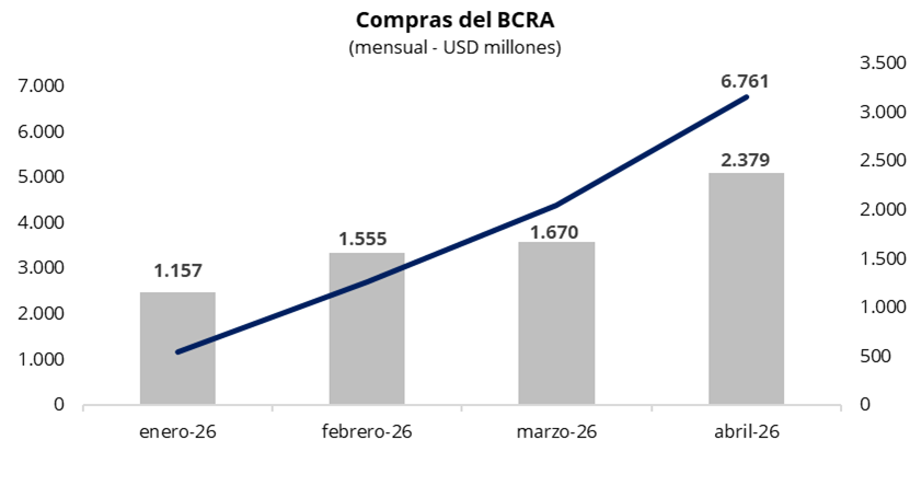 En una rueda con un volumen operado cercano a los USD 950 millones, el más alto desde marzo de 2025, el Banco Central cerró la semana con compras por USD 80 millones, acumulando USD 2.379 millones en abril y USD 6.761 millones en lo que va del año. De este modo, en un contexto de presión al alza del tipo de cambio, el BCRA moderó su intervención en el mercado oficial, adquiriendo cerca del 8% del volumen operado.