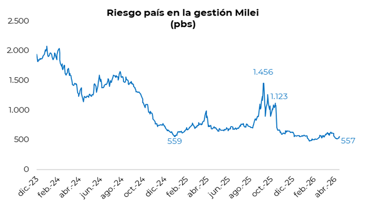 Los bonos soberanos en dólares cerraron una semana negativa, con una caída promedio del 0,2% el viernes. En el balance semanal, los Globales en Nueva York cayeron en promedio un 1,9%, llevando el precio promedio ponderado por outstanding a la zona de USD 76,9. En línea con esta dinámica, el riesgo país subió 38 puntos básicos en la semana, ubicándose en torno a los 557 puntos básicos.