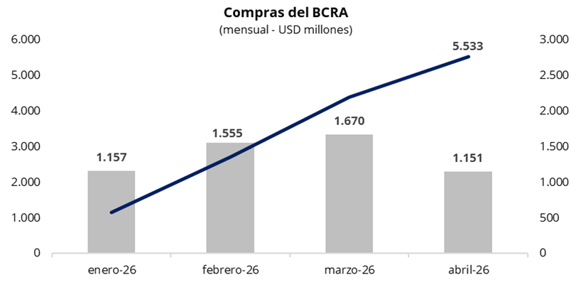 En una rueda con un volumen operado cercano a los USD 580 millones, el Banco Central arrancó la semana con compras por USD 112 millones, acumulando USD 1.151 millones en abril y USD 5.533 millones en lo que va del año. De esta manera, el BCRA adquirió cerca del 20% del volumen operado en el mercado oficial, muy por encima del target de participación establecido.