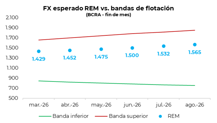 Por el lado cambiario, el tipo de cambio oficial mayorista (A3500) se proyecta en $1.707 para fin de año, es decir, $43,2 por debajo del relevamiento previo. En cuanto a la tasa de interés, el REM mostró revisiones levemente al alza en las proyecciones para los próximos meses, aunque manteniendo un sendero gradualmente descendente. En ese marco, se estima una tasa en torno al 24,0% TNA hacia fin de año, lo que implica un aumento de 1,6 p.p. respecto del relevamiento de enero.