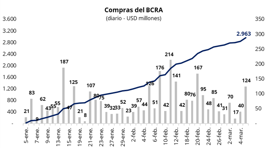 En una rueda con un volumen operado cercano a los USD 350 millones, el Banco Central volvió a acelerar el ritmo de compras y adquirió USD 124 millones en el mercado oficial. De esta manera, el BCRA acumula compras por USD 251 millones en las primeras cuatro jornadas del mes y USD 2.963 millones en lo que va del año. En términos del volumen operado, el BCRA compró cerca del 35% del total negociado en el mercado oficial, marcando la mayor intervención relativa desde el 20 de febrero.
