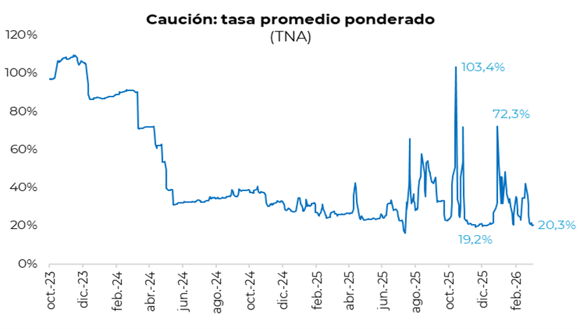 En el mercado de pesos, la curva a tasa fija mostró una jornada mayormente neutra en el tramo corto, mientras que la parte larga fue deteriorándose a lo largo del día y terminó con leves caídas. En la misma línea, la curva CER también registró una rueda entre neutra y levemente negativa, con algo más de presión vendedora en el tramo corto. Por su parte, la caución a 1 día promedió 20,3% TNA, en línea con las últimas jornadas, aunque la dinámica intradiaria fue distinta. Habitualmente la tasa venía operando cerca de 20% durante la mayor parte del día y en la última hora descendía hacia la zona de 15–17%. Ayer, en cambio, cerró la rueda en torno al 25%. Hacia adelante, habrá que ver si este movimiento responde a un cambio en el nivel de liquidez del sistema, luego de la absorción de pesos de esta semana vinculada a la venta de la letra dólar linked con vencimiento en abril.