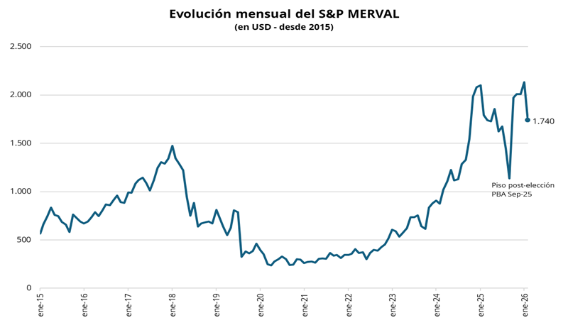 Por el lado corporativo, Loma Negra presentó los resultados correspondientes al último trimestre de 2025. En el año, los despachos de cemento crecieron 2,4% interanual; sin embargo, en el 4T25 registraron una caída del 1,5% respecto al 4T24. En términos de ingresos, las ventas en pesos retrocedieron 1,7% interanual en el 4T25 y acumularon una baja de 7,8% en todo 2025 frente a 2024. En este contexto, el EBITDA ajustado mostró una fuerte contracción, con una caída de 33% interanual en el 4T25 y de 24% en el acumulado del año. Los márgenes también comprimieron, ubicándose en 19,7% en el 4T25 (vs. 29% en 4T24) y en 21,3% para 2025 (vs. 25,9% en 2024).