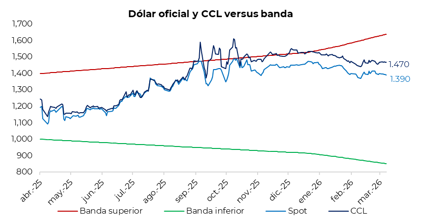 El tipo de cambio oficial se ubica en $1.390, un 15% por debajo de la banda superior del esquema cambiario, actualmente en $1.639. A su vez, los dólares financieros tuvieron una jornada estable, prácticamente sin modificaciones: el CCL finalizó en torno a los $1.470, con la brecha respecto del oficial en la zona de 5,5%. En tanto, el dólar MEP cerró cerca de $1.420, manteniendo la brecha con el oficial a alrededor del 2,0%. Por último, el diferencial entre el CCL y el MEP se sostuvo en torno al 3,25%.