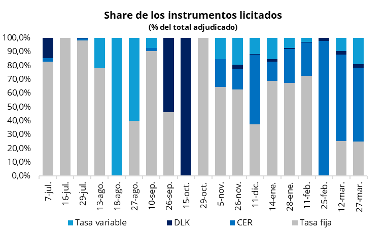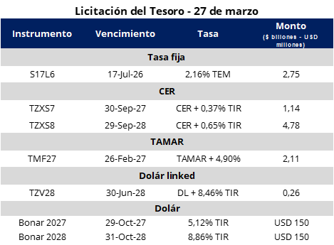 La contrapartida positiva vino por el lado de los pesos. El Tesoro consiguió estirar los plazos de colocación sin necesidad de ofrecer rendimientos más altos a los inversores. Se captaron AR$ 11 billones contra vencimientos de AR$ 8 billones, lo que arroja un ratio de refinanciamiento del 138,5%. La LECAP con vencimiento en julio 2026 (S17L6) salió al 2,16% TEM, prácticamente calcada a lo que marca la curva del mercado secundario (con la S31L5 en 2,10% y la T30J6 en 2,05%). Vale destacar que es el plazo mínimo más extenso que se ofrece para este tipo de instrumento desde diciembre, logrando alargar la duration sin costo adicional.