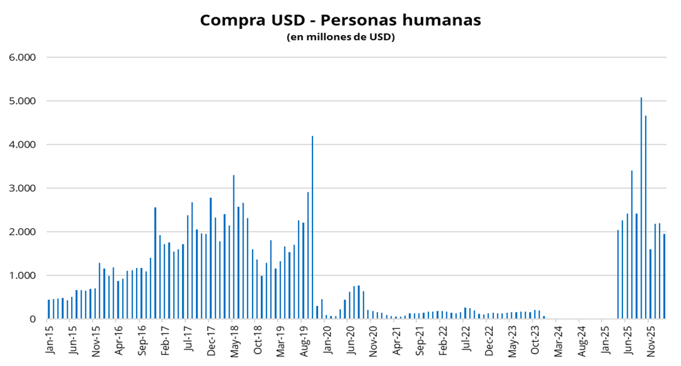 Por otra parte, las "Personas humanas" realizaron compras netas de moneda extranjera por USD 2.552 millones, principalmente en billetes sin fines específicos por USD 1.954 millones. No obstante, el BCRA estima que, del total de salida por billetes y divisas sin fines específicos (USD 2.000 millones entre individuos y empresas), unos USD 900 millones se destinaron al pago de consumos con tarjeta en el exterior, USD 300 millones a importaciones y otras obligaciones, y USD 600 millones quedaron depositados en bancos locales. De esta manera, los egresos que efectivamente incrementaron la posición de activos externos del "Sector Privado No Financiero" en febrero se estiman en torno a los USD 200 millones.
