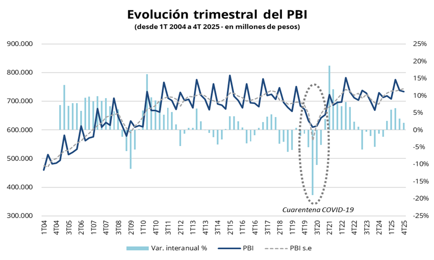 En términos desestacionalizados, el PBI aumentó un 0,6% en el cuarto trimestre de 2025 respecto al tercero, con un desempeño impulsado por las exportaciones (+5,0%) y el consumo privado (+1,7%), mientras que el consumo público (-1,0%) y la formación bruta de capital fijo (-2,8%) mostraron caídas. En la comparación interanual, el PBI creció un 2,1%, con una fuerte suba de las exportaciones (+10,9% interanual) entre los componentes de la demanda. Por el lado de la actividad, se destacaron la intermediación financiera (+17,2% interanual), la agricultura, ganadería, caza y silvicultura (+16,1% interanual) y la pesca (+10,6% interanual).