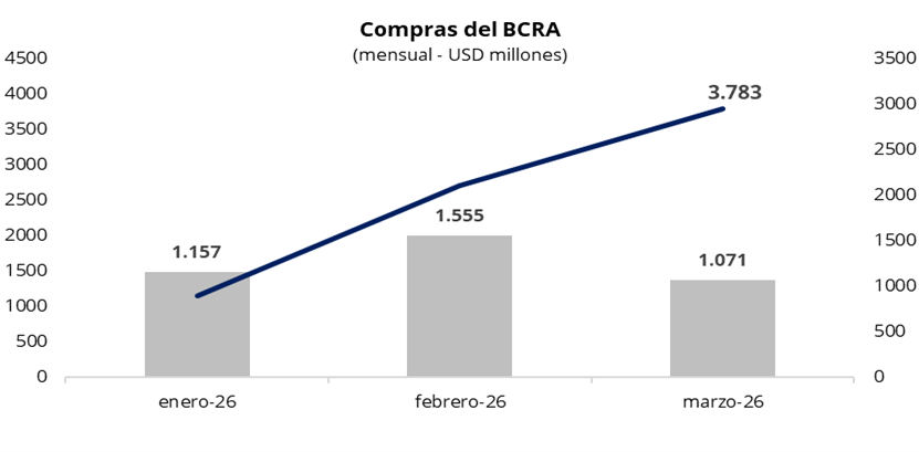 En una rueda con un volumen operado cercano a los USD 360 millones, el Banco Central cerró la semana con compras por USD 172 millones, la mayor desde el 11 de febrero. De esta manera, el BCRA acumula USD 1.071 millones en marzo y USD 3.783 millones en lo que va del año, con un promedio de compras de USD 71 millones por rueda. El viernes el Banco Central mostró una fuerte intervención en el mercado, al adquirir cerca del 50% del volumen operado, superando ampliamente el target de participación establecido.