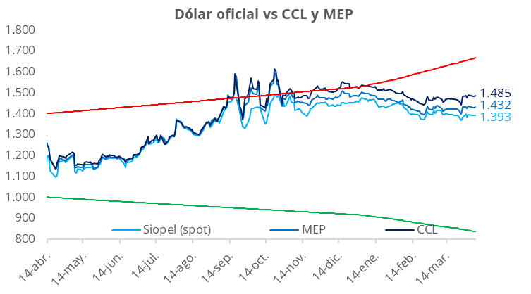 El tipo de cambio oficial cerró sin cambios, ubicándose en $1.393. A su vez, los dólares financieros tuvieron una jornada levemente al alza: el CCL finalizó en torno a los $1.485, con la brecha respecto del tipo de cambio oficial en la zona de 6,5%. En tanto, el dólar MEP cerró alrededor de $1.430, manteniendo la brecha con el tipo de cambio oficial alrededor del 2,5%. Por último, el diferencial entre el CCL y el MEP se sostuvo en torno al 3,5%.