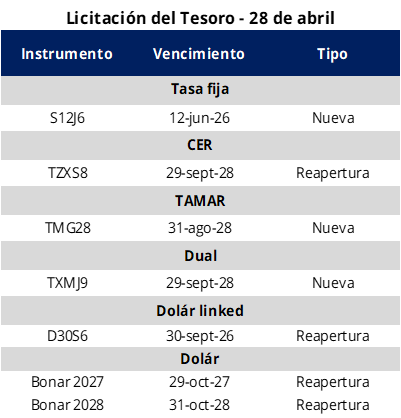 Por el lado de los instrumentos a tasa fija se licitará una nueva LECAP con vencimiento 12 de junio de 2026 (S12J6), mientras que en el segmento CER se ofrecerá la reapertura del BONCER con vencimiento 29 de septiembre de 2028 (TZXS8). Adicionalmente, se licitará una nueva TAMAR con vencimiento 31 de agosto de 2028 (TMG28). Por último, el menú se completa con un nuevo bono dual CER/TAMAR con vencimiento 29 de junio de 2029 (TXMJ9) y la reapertura del bono dólar linked con vencimiento 30 de septiembre de 2026 (D30S6).