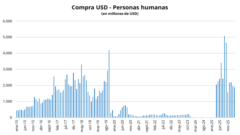 Por otra parte, en marzo, 1,5 millones de personas compraron billetes por un total de USD 2.363 millones, lo que implicó una caída de USD 5 millones respecto del mes previo. La formación neta de activos externos de las personas humanas se ubicó en USD 2.208 millones (USD 1.897 millones en billetes y USD 311 millones en divisas). Es decir, cayó USD 270 millones respecto a febrero.