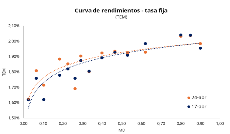Por el lado de la deuda soberana en pesos, la curva a tasa fija extendió la tendencia de la semana, con suba de tasas en la rueda del viernes, cerrando con toda la curva en el rango de 1,6%–2,0% TEM. En el tramo corto, los vencimientos de abril, mayo y junio operaron con tasas en torno a 1,6%–1,9% TEM, mientras que el tramo largo se ubicó entre 1,8% y 2,0% TEM. La tasa de caución se mantuvo estable, con la caución a 3 días (próximo día hábil) promediando 20,0% TNA. Por su parte, la curva CER operó a la baja en el tramo largo, manteniendo las tasas reales en terreno negativo hasta marzo de 2027.