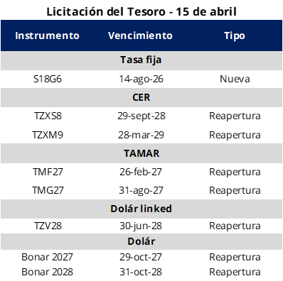Por el lado de los instrumentos a tasa fija se licitará una nueva LECAP con vencimiento 14 de agosto de 2026 (S18G6). En tanto, dentro del segmento CER se ofrecerán dos reaperturas: el BONCER con vencimiento 29 de septiembre de 2028 (TZXS8) y el BONCER con vencimiento 28 de marzo de 2029 (TZXM9). Adicionalmente, se licitarán dos reaperturas de instrumentos TAMAR con vencimientos 26 de febrero de 2027 (TMF27) y 31 de agosto de 2027 (TMG27). Por último, el menú se completa con la reapertura del bono dólar linked con vencimiento 30 de junio de 2028 (TZV28).