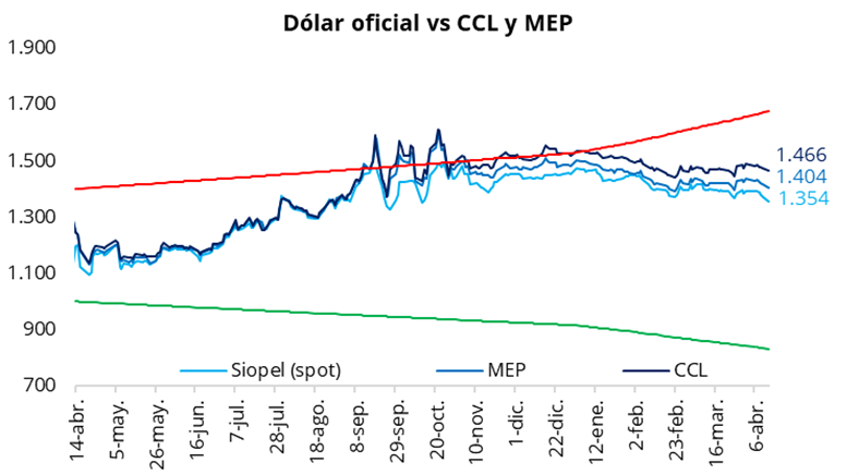 El tipo de cambio oficial inició la semana profundizando su tendencia bajista, al cerrar la jornada en $1.354 (-$16 respecto del viernes). De esta manera, el dólar oficial encadenó su sexta rueda consecutiva a la baja, ubicándose en niveles de mediados de octubre del año pasado. Con esta nueva caída, se posicionó un 19,2% por debajo de la banda superior de $1.676, marcando la mayor distancia desde junio de 2025. En la misma línea, los dólares financieros también registraron bajas al comienzo de la semana: el CCL cerró en torno a $1.465 (-0,6%), mientras que el MEP finalizó cerca de $1.405 (-0,8%). En este contexto, la brecha entre el CCL y el tipo de cambio oficial se amplió a 8,5%, mientras que el diferencial entre el CCL y el MEP se mantuvo en torno al 4,25%.