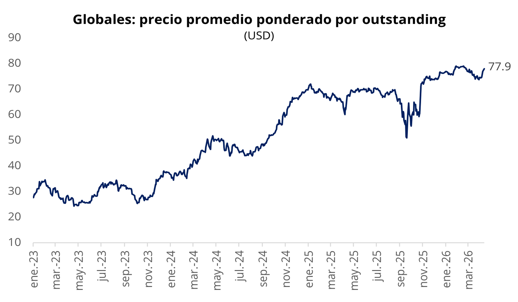 Por su parte, los bonos soberanos en dólares extendieron la racha positiva y acumularon su sexta jornada consecutiva al alza en Nueva York. En este contexto, los Globales avanzaron en promedio un 0,9%, llevando el precio promedio ponderado a la zona de USD 77,9 y volviendo a los niveles de mediados de febrero. En línea con esta dinámica, el riesgo país continuó su compresión y cerró la jornada en torno a los 530 puntos básicos.