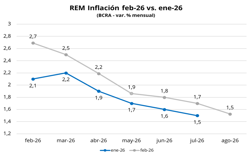 El Banco Central de la República Argentina (BCRA) difundió ayer el Relevamiento de Expectativas de Mercado (REM) correspondiente al mes de febrero, en el que se observó una nueva corrección al alza en las proyecciones de inflación para los próximos meses. Según el relevamiento, se espera una inflación del 2,7% para febrero (vs. 2,1% en el REM previo) y del 2,5% para marzo (vs. 2,2%). Asimismo, la mediana de las estimaciones se ajustó al alza en todos los meses siguientes, marcando el octavo relevamiento consecutivo en el que se eleva el pronóstico para el primer mes de la muestra y el tercero en el que se revisan al alza las proyecciones para cada uno de los seis meses siguientes. De todas maneras, las estimaciones continúan reflejando una desaceleración gradual de la inflación hacia adelante, consolidando la expectativa de un sendero de desinflación. Para 2026, las consultoras estiman una inflación anual de 26,1%, lo que implica una suba de 3,6 p.p. respecto al REM de enero.