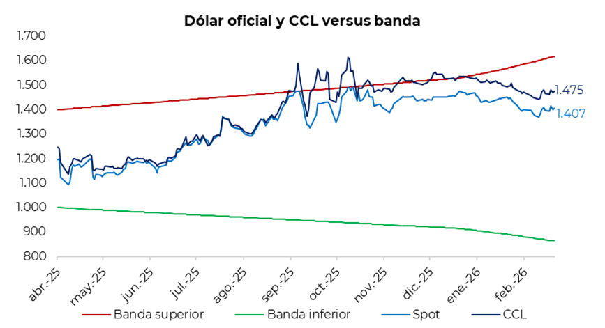 En la jornada de ayer, el tipo de cambio oficial comenzó la rueda estable en la zona de $1.400 para luego finalizar con un avance del 0,5%, ubicándose en $1.407 (+$6,5 respecto del cierre del miércoles). El BCRA aceleró el ritmo de compras frente a la rueda previa. De esta manera, el dólar oficial se mantiene un 12,9% por debajo del techo de la banda superior ($1.616). En la misma línea, los dólares financieros registraron subas: el CCL cerró en torno a $1.475 (+0,5%), mientras que el dólar MEP finalizó en la zona de $1.435 (+0,6%). En consecuencia, la brecha entre el CCL y el dólar oficial se ubicó alrededor del 5,5%, mientras que el diferencial entre el CCL y el MEP se mantiene en torno al 3,0%.