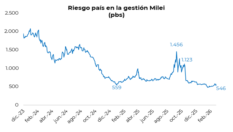 En el mercado de pesos, la curva a tasa fija mostró una jornada mayormente neutra en el tramo corto, mientras que la parte larga fue deteriorándose a lo largo del día y terminó con leves caídas. En la misma línea, la curva CER también registró una rueda entre neutra y levemente negativa, con algo más de presión vendedora en el tramo corto. Por su parte, la caución a 1 día promedió 20,3% TNA, en línea con las últimas jornadas, aunque la dinámica intradiaria fue distinta. Habitualmente la tasa venía operando cerca de 20% durante la mayor parte del día y en la última hora descendía hacia la zona de 15–17%. Ayer, en cambio, cerró la rueda en torno al 25%. Hacia adelante, habrá que ver si este movimiento responde a un cambio en el nivel de liquidez del sistema, luego de la absorción de pesos de esta semana vinculada a la venta de la letra dólar linked con vencimiento en abril.